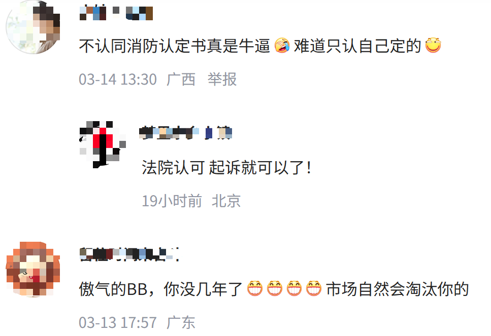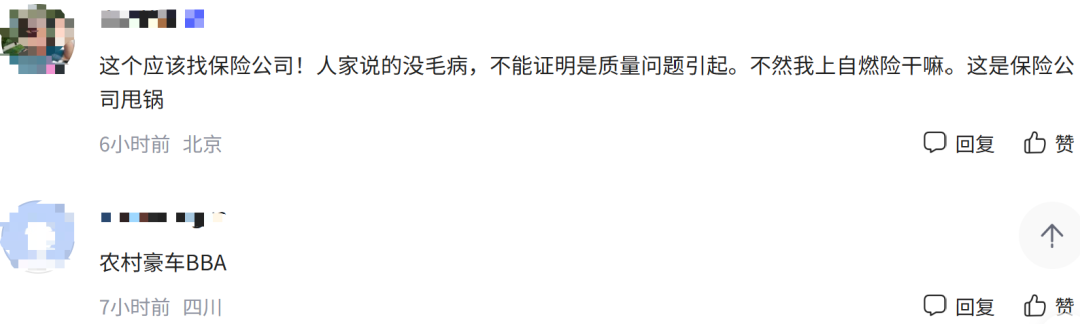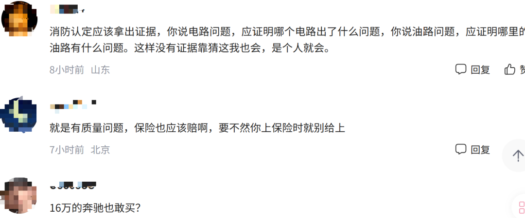 对于此事,网友也表达了不同看法,有部分网友认为,连消防认定书都不认同,4S店和厂家太傲慢了,市场会教他做人。还有部分网友认为,厂家和4S店并没有问题,“就是有质量问题,保险也应该赔啊,要不然你上保险时就别给上”。还有网友认为“消防认定应该拿出证据,你说电路问题,应证明哪个电路出了什么问题,你说油路问题,应证明哪里的油路有什么问题。”