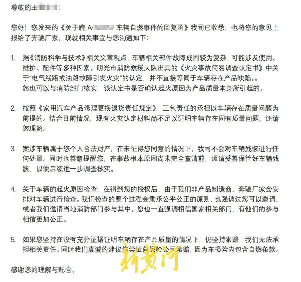 事故发生后,王女士联系投保的保险公司,工作人员查看消防认定书后表示,此次自燃系车辆自身质量问题,且处于质保期内,损失应由奔驰厂家承担。然而,当王女士将消防认定书提交给涉事4S店及奔驰厂家后,对方却给出了截然不同的回应。