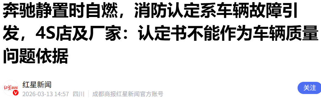 电动知家消息,近日,据新黄河、红星新闻等多家媒体报道,一辆行驶才8000多公里的奔驰汽车,在质保期内、静置状态下突发自燃,消防认定系车辆故障引发,但4S店及厂家却拒绝承认是车辆质量有问题,认为认定书不能作为车辆质量问题依据。