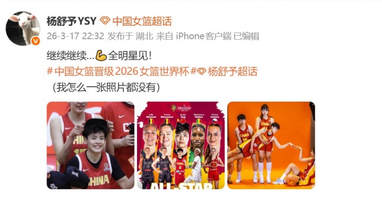 赛后,杨舒予发博庆祝,并写道:“继续继续…💪全明星见!(我怎么一张照片都没有)。”